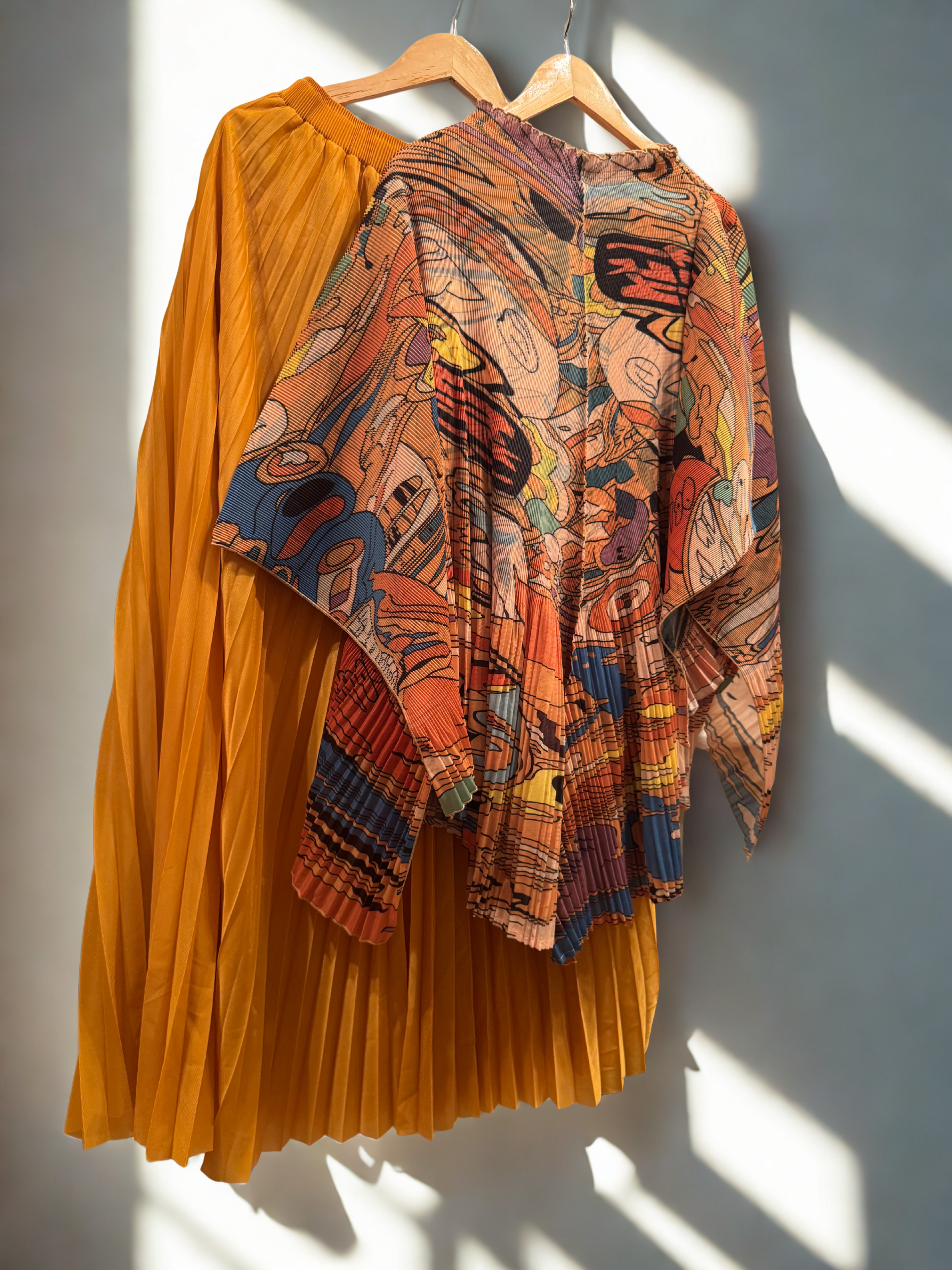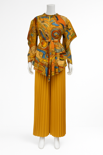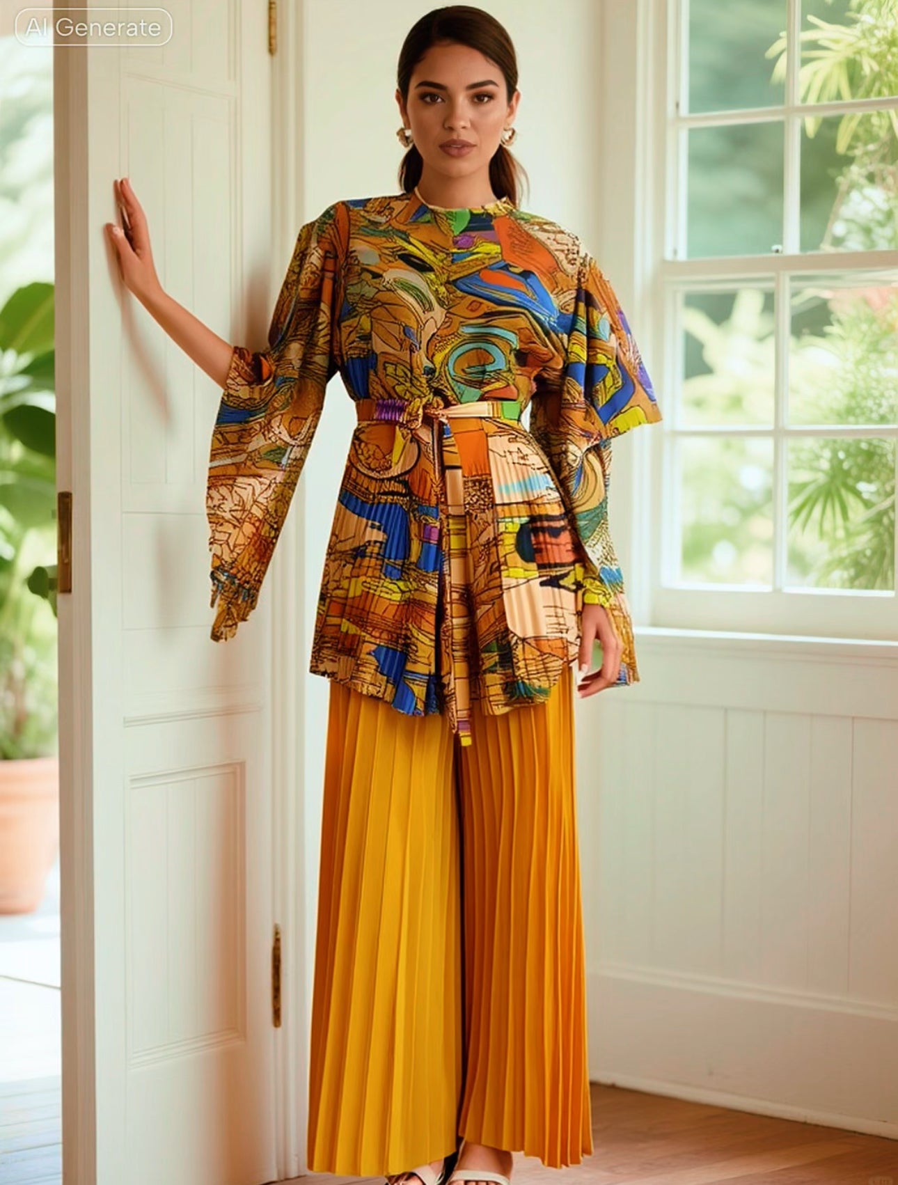 Step into elegance with this pleated two-piece set, designed from soft stretch fabric for comfort, style, and a flawless fit. The pleated top features a vibrant multicolor abstract print with a tie-belt waist that accentuates your shape while offering a relaxed, flowing silhouette.
