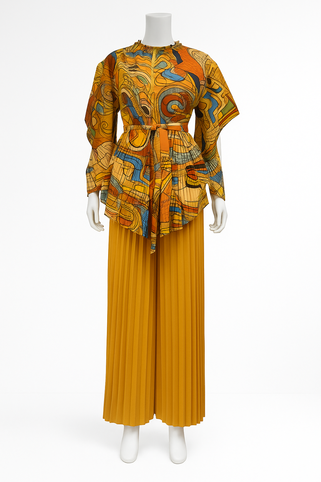 The mustard yellow wide-leg pleated trousers add a bold yet classy finish, making this set versatile enough for parties, evening outings, and special occasions. Lightweight, breathable, and stretchy, it’s tailored for both comfort and standout style.