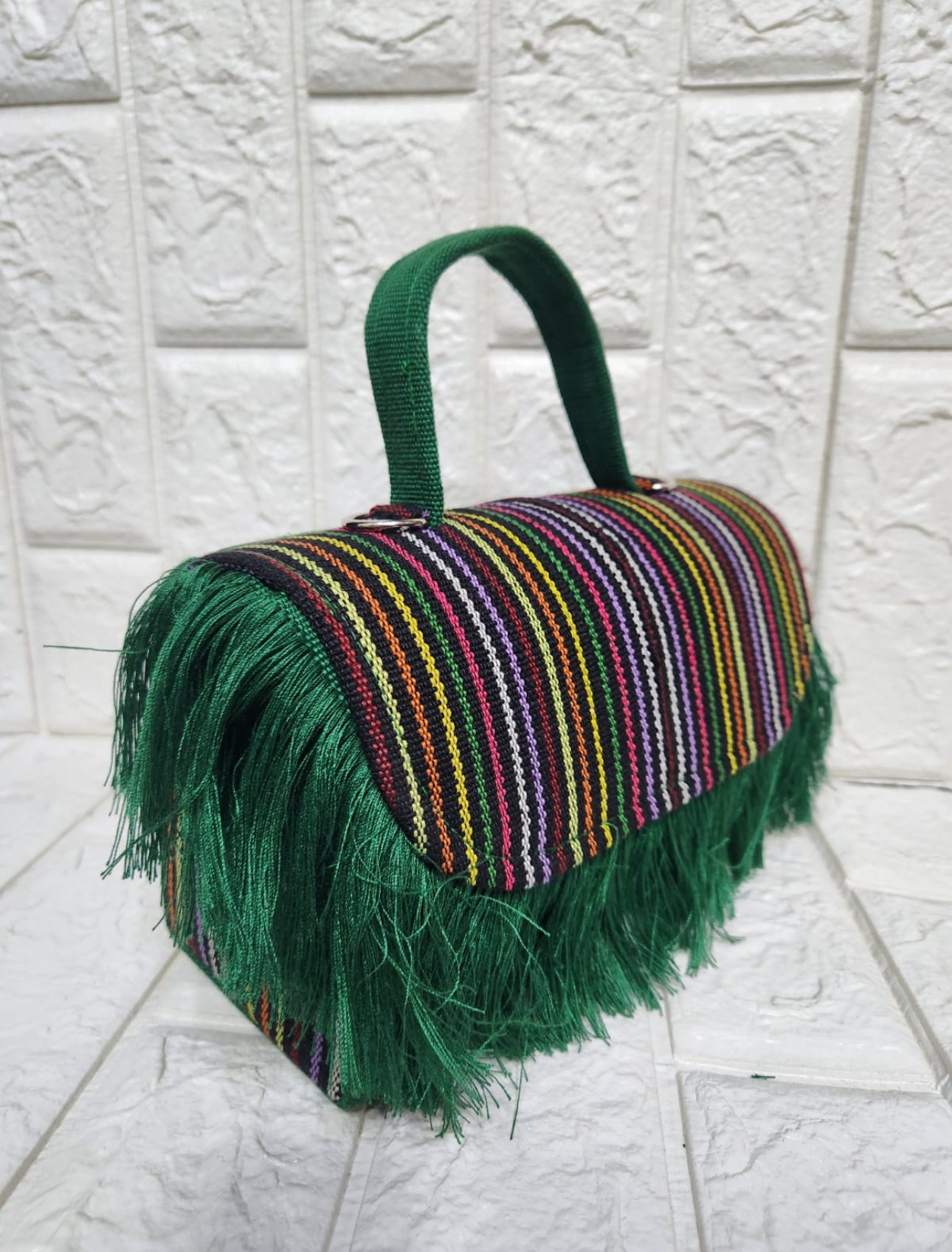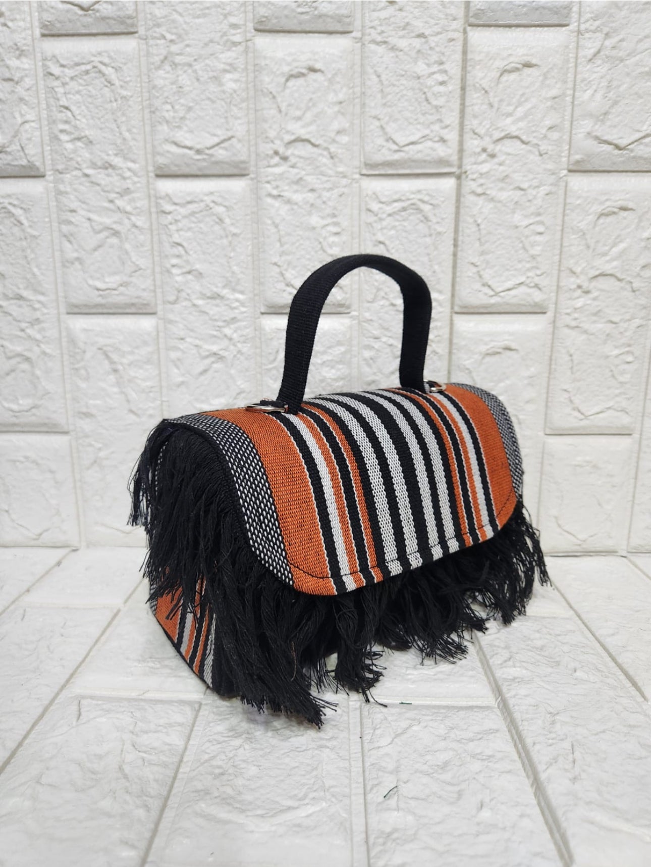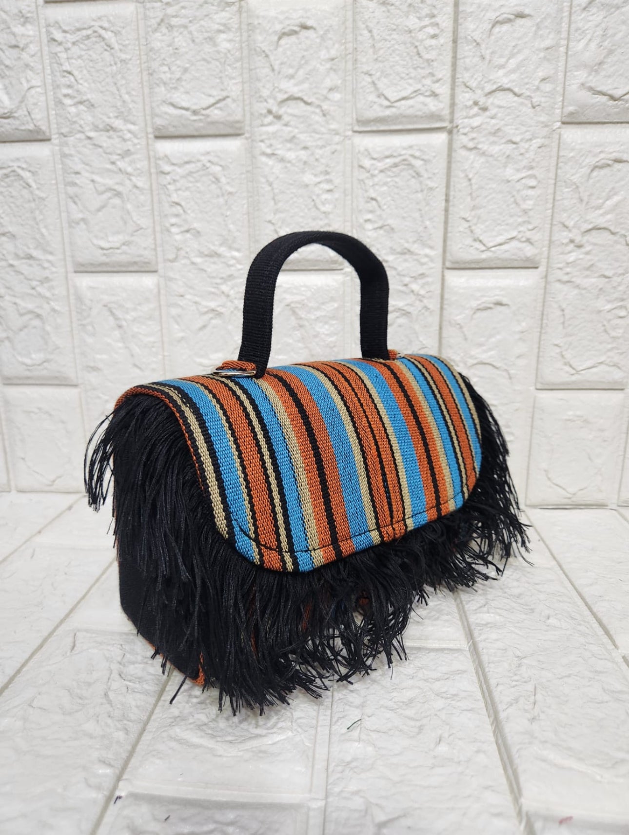 The Aso-Oke Mini Fringe Bag is a statement accessory crafted from traditional Aso-Oke fabric, designed to elevate both casual and special-occasion looks. Featuring vibrant woven stripes and luxurious fringe detailing, this mini bag blends rich African heritage with modern style.
