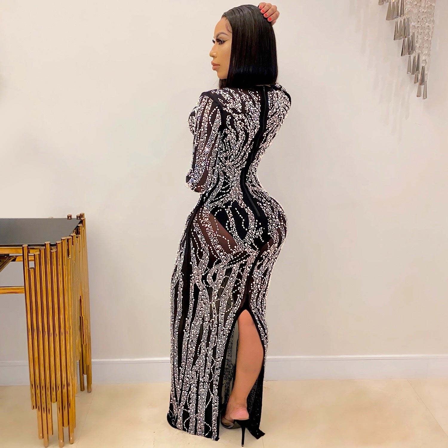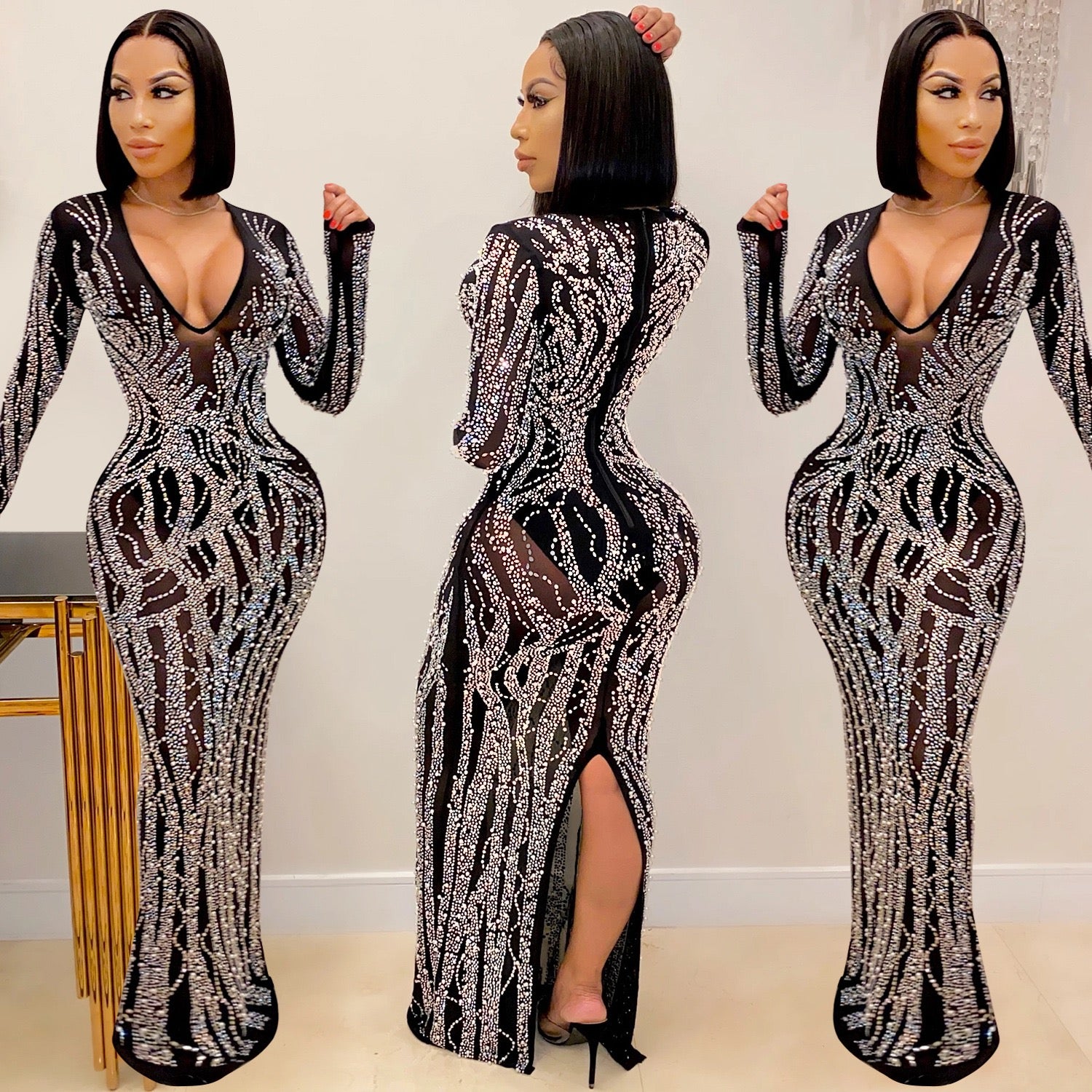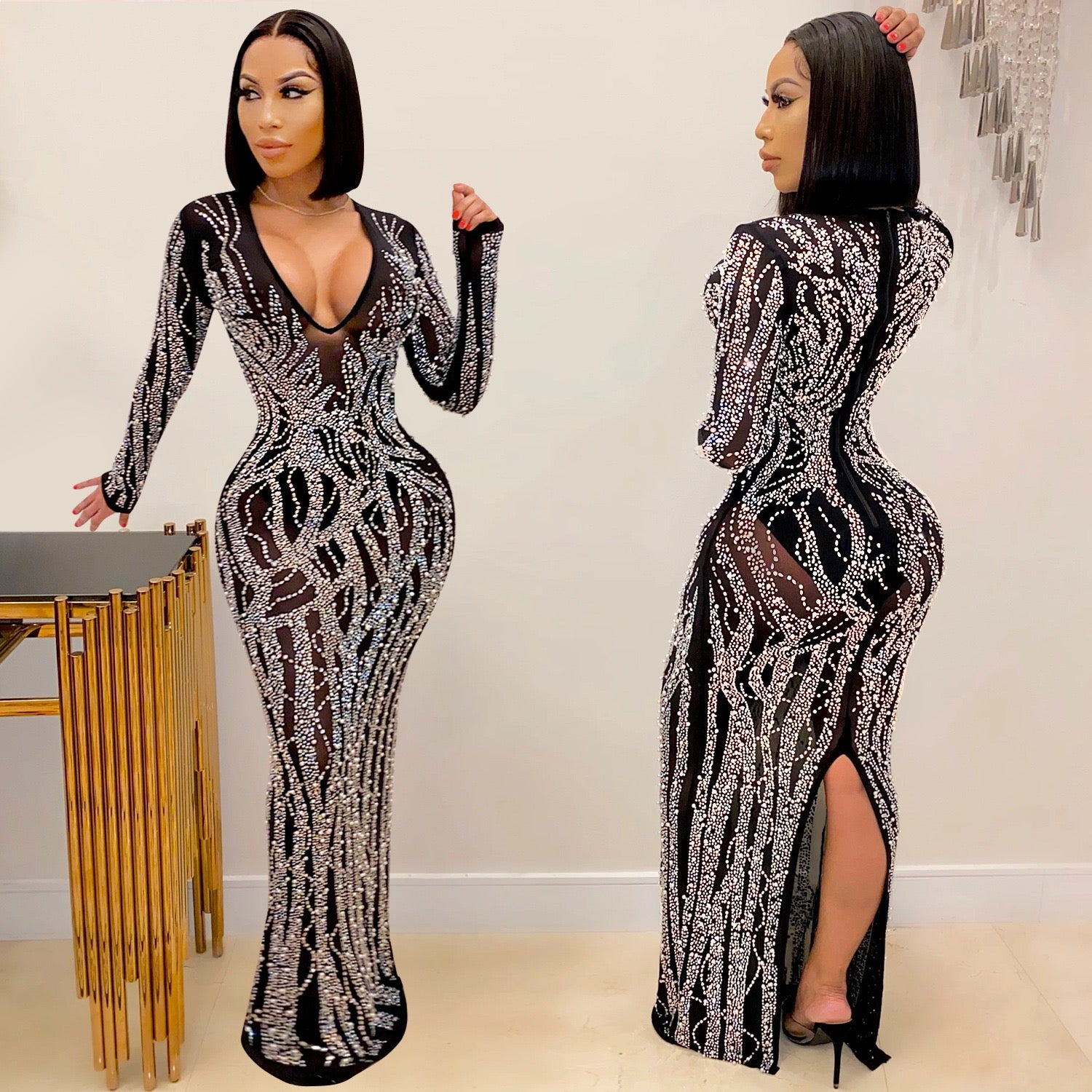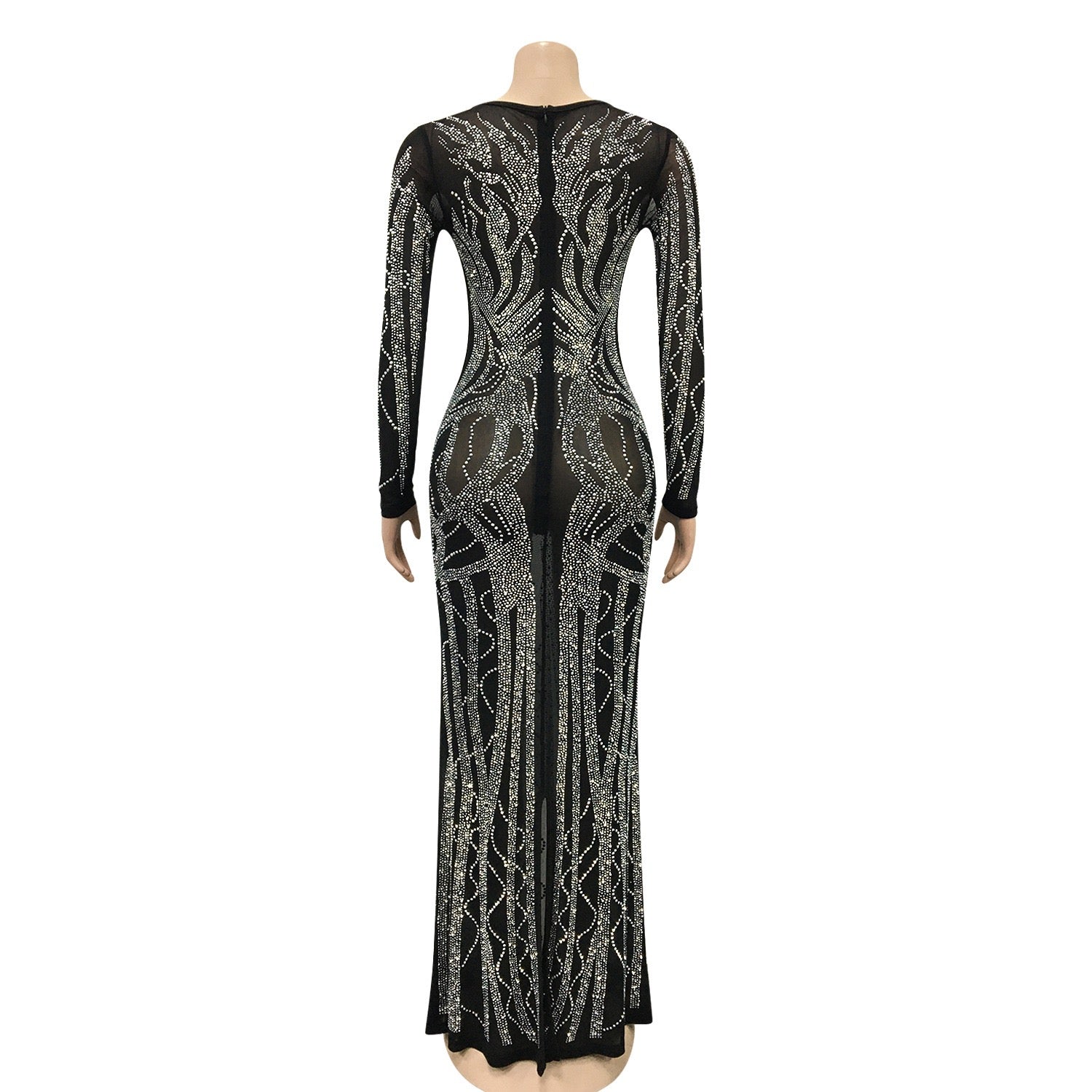 Black Rhinestone V-Neck Long Sleeve Maxi Dress