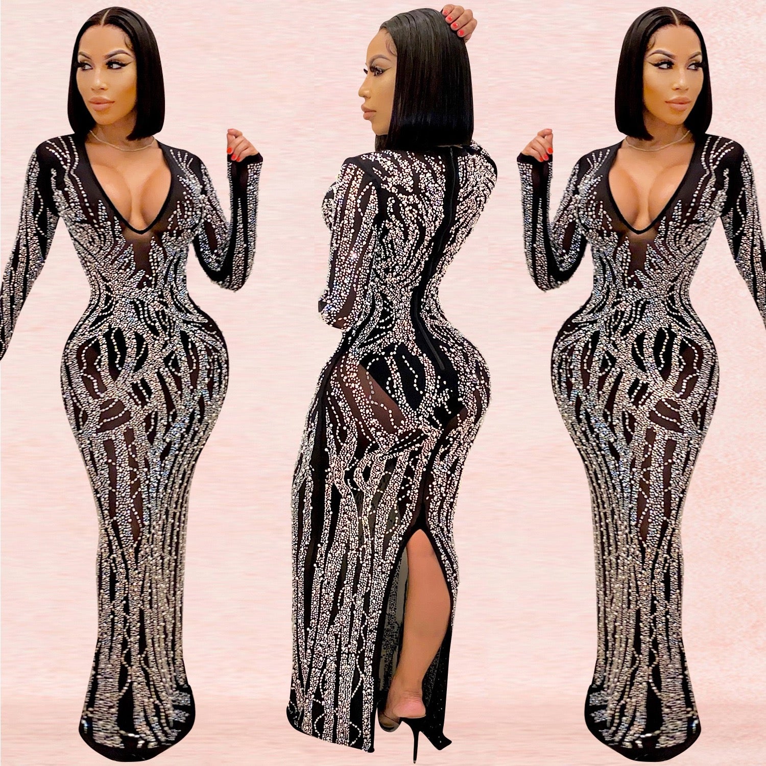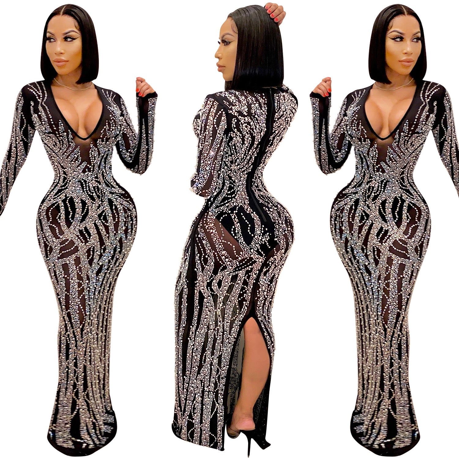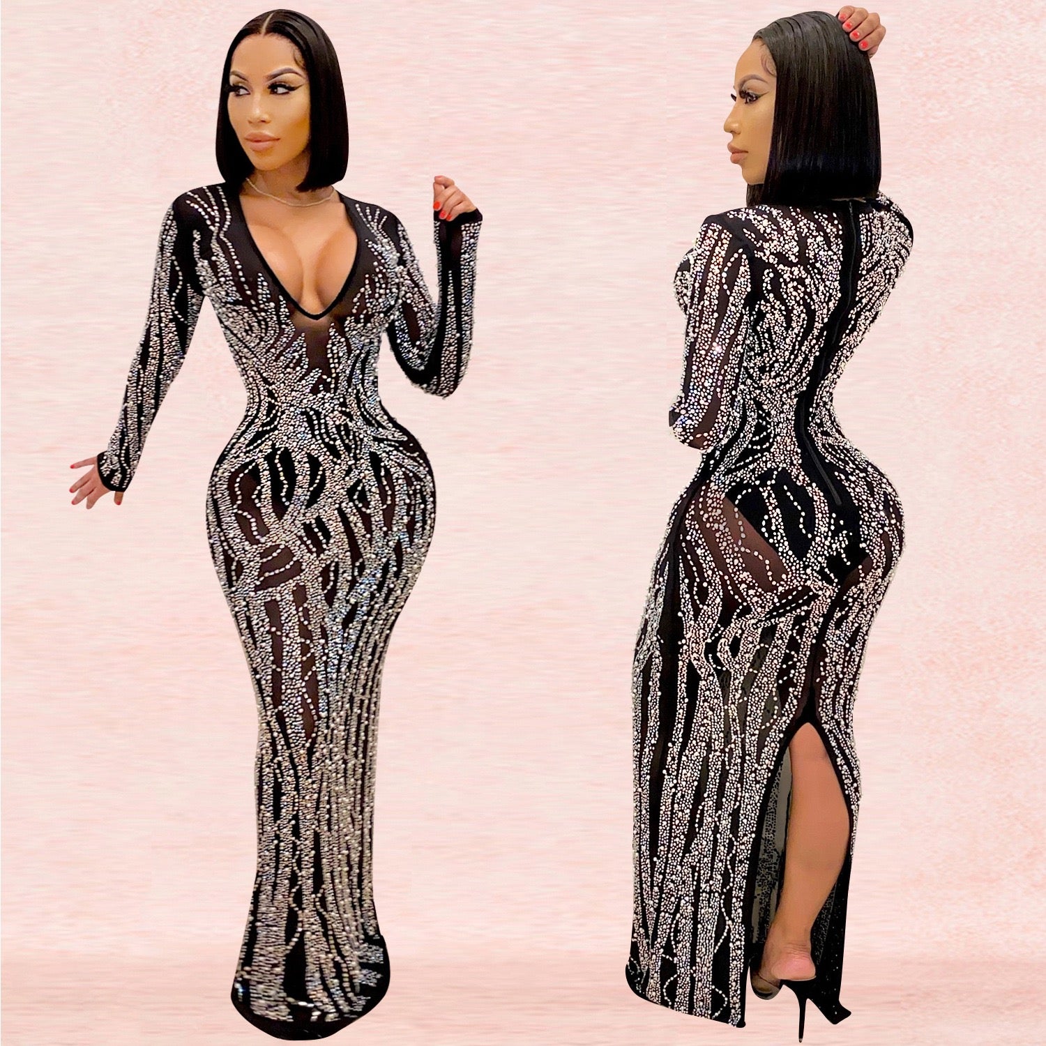 Make a bold and elegant statement with this luxury black rhinestone maxi dress, designed to flatter your curves while delivering high-impact glamour. Featuring a deep V-neckline, long sleeves, and a slim-fit silhouette, this dress is finished with hot-drilled rhinestone detailing in a striking geometric pattern that sparkles beautifully under light.