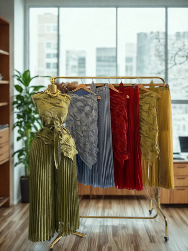 👖 Bottom – Wide-leg pleated trousers designed for movement, flow, and grace. Made from a stretchy fabric with a flattering one-size fit, perfect for different body shapes.
