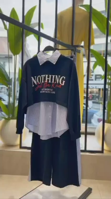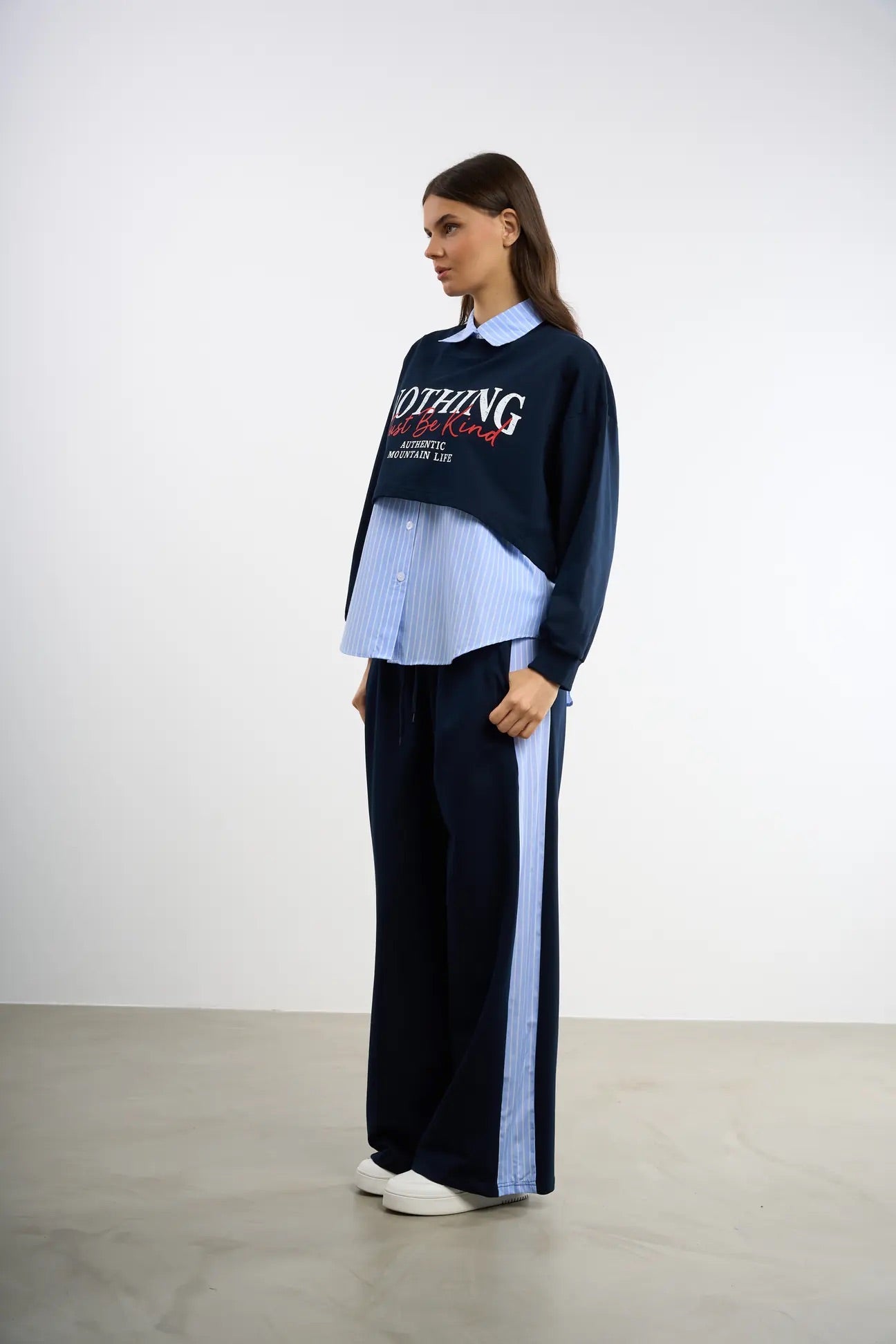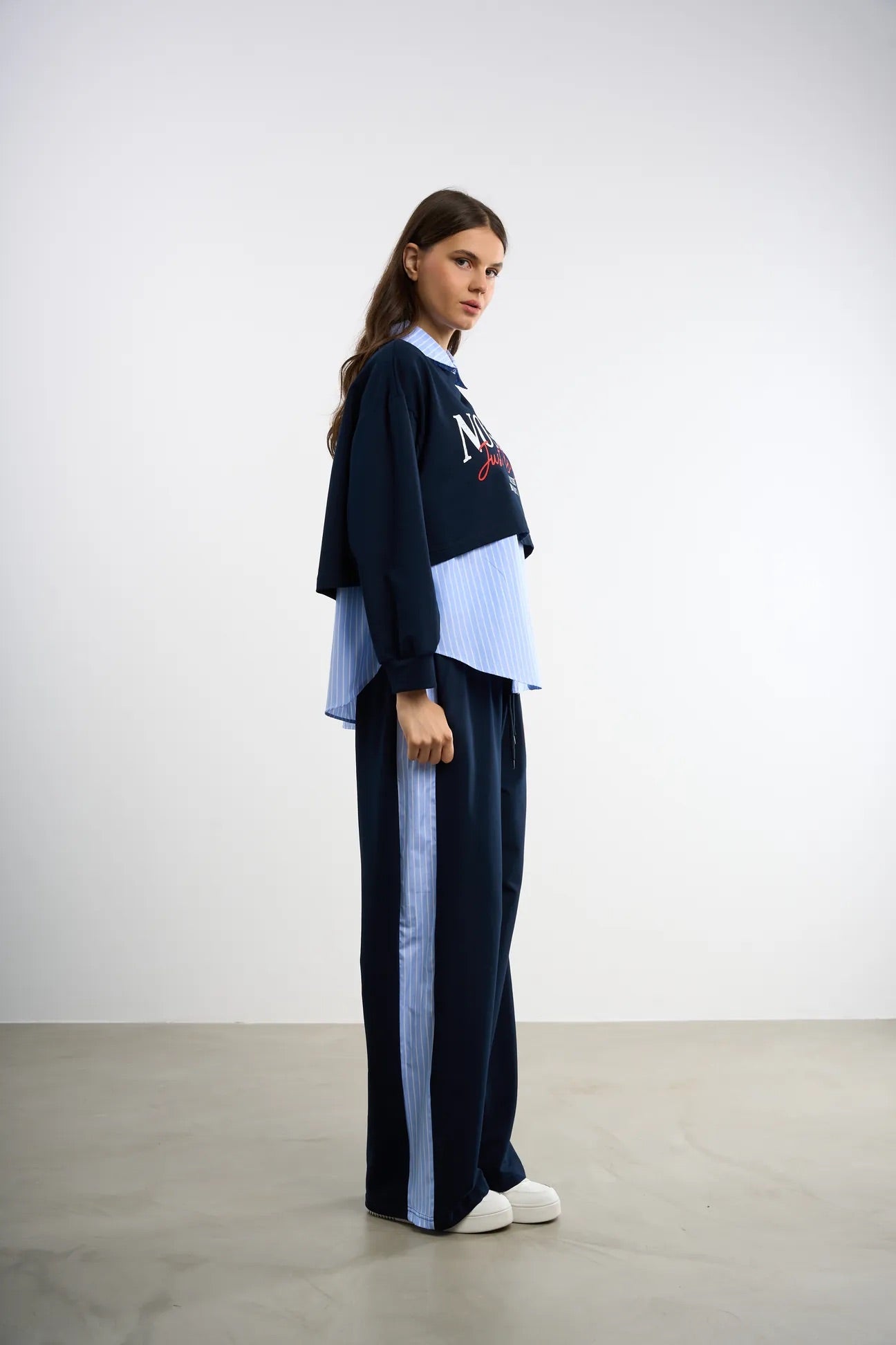 - 3-piece co-ord (crop sweatshirt + striped shirt + wide-leg trousers)