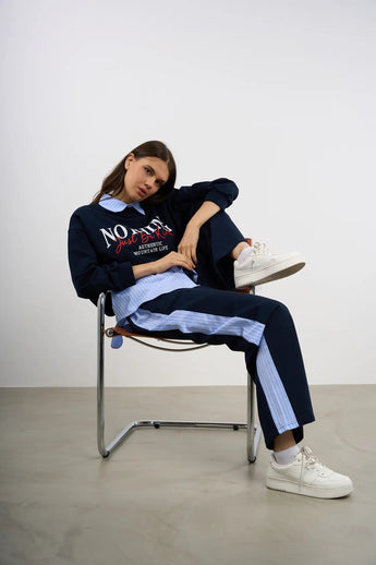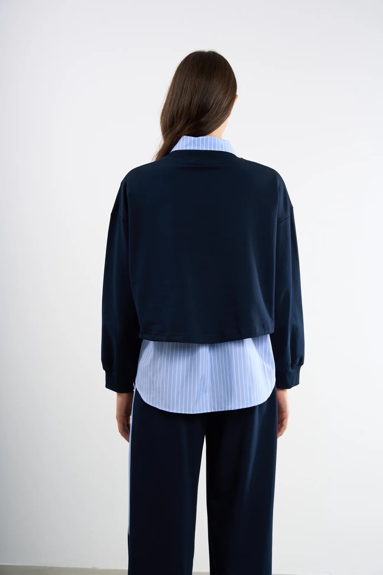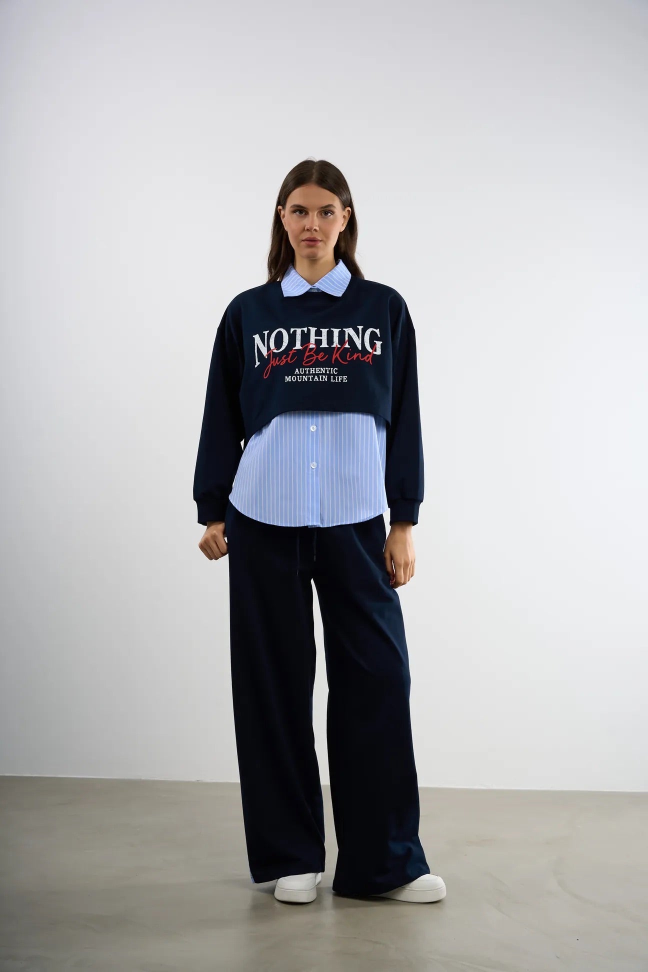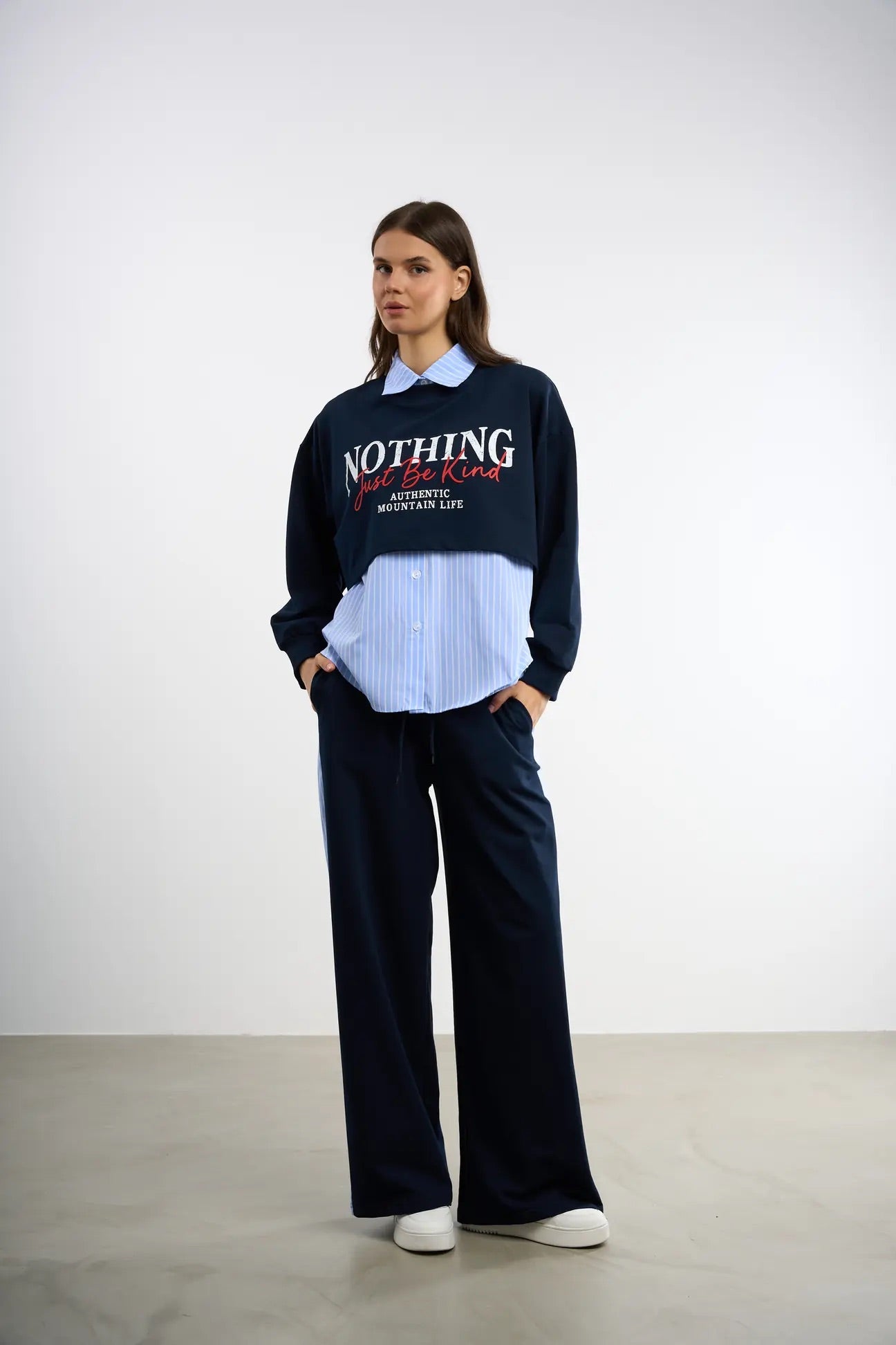 - 3-piece co-ord (crop sweatshirt + striped shirt + wide-leg trousers)