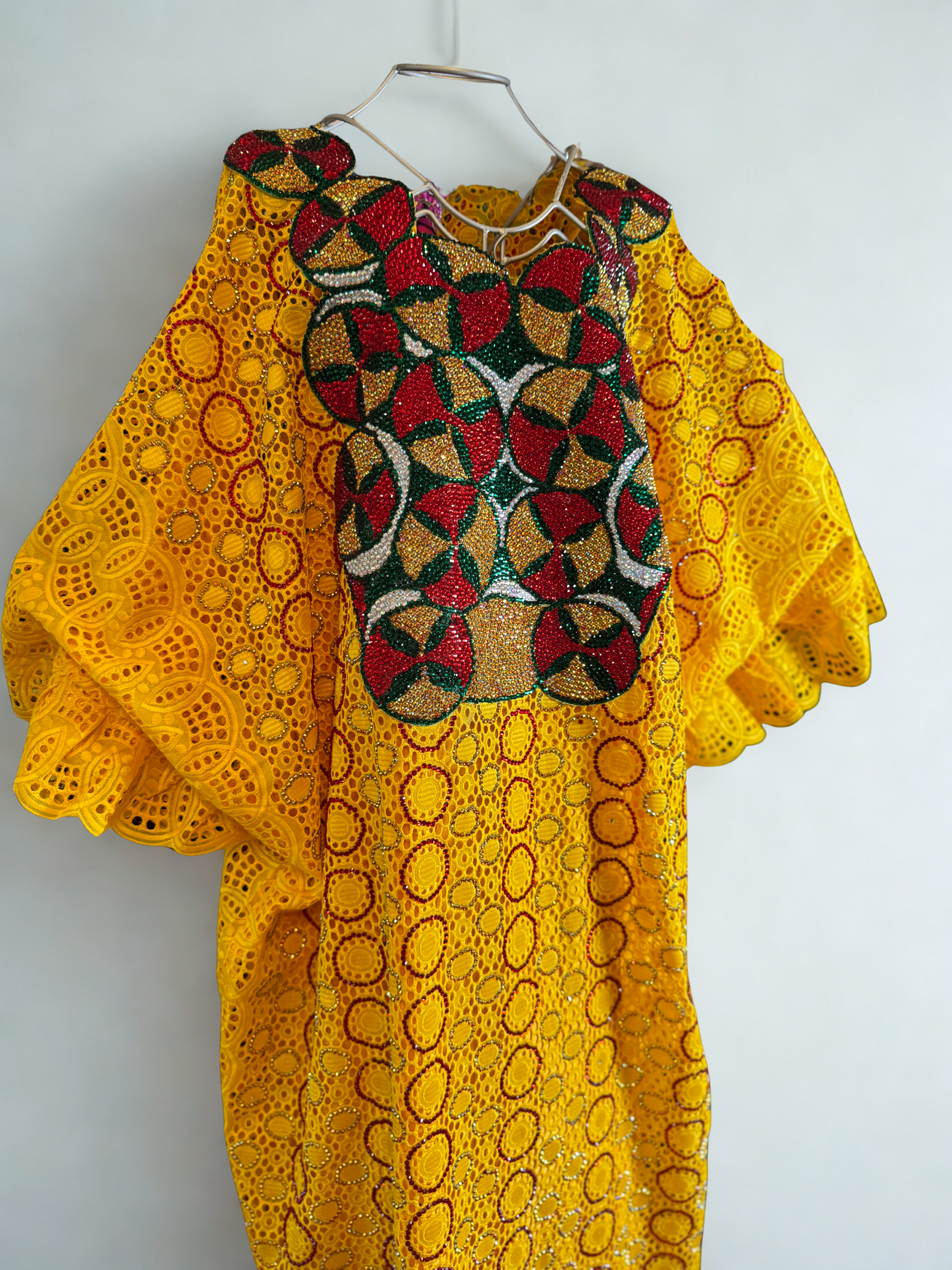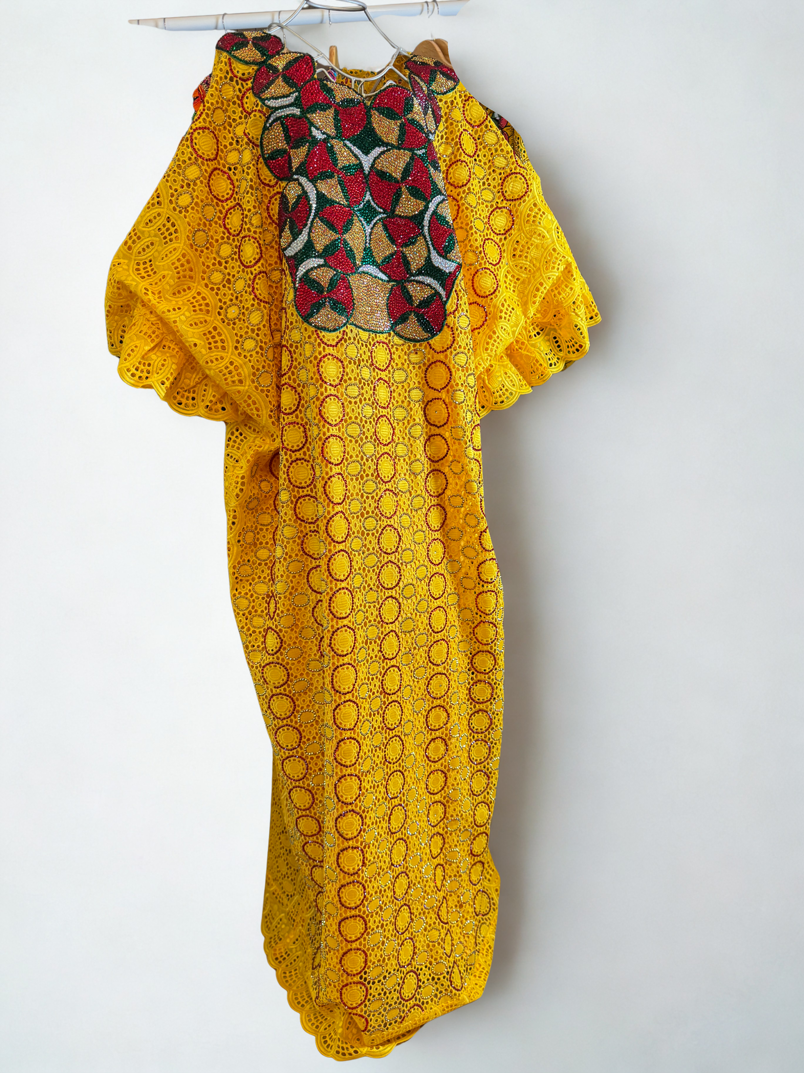 Expertly designed in Senegal, this kaftan is crafted from premium Swiss voile lace and features intricate embroidery and sparkling rhinestone accents across the chest, adding just the right touch of glamour. The bright yellow hue enhances your skin tone, while the flowing butterfly sleeves offer a relaxed yet regal silhouette.